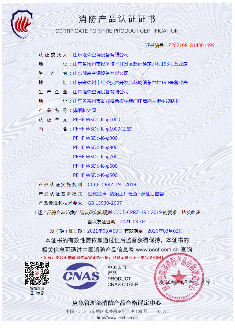 • 防爆排煙防火閥合格證