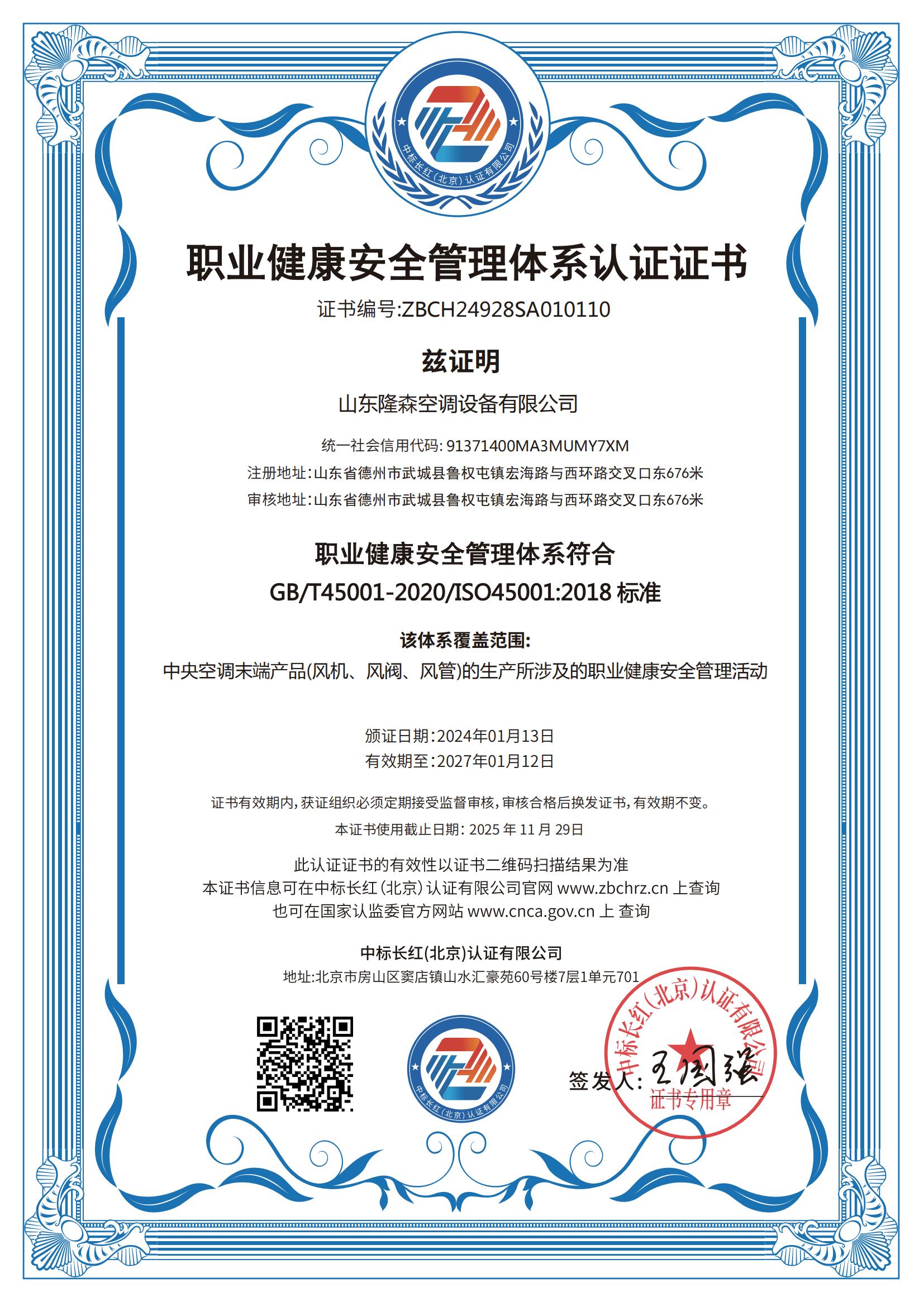 • 職業健康安全管理體系認證證書